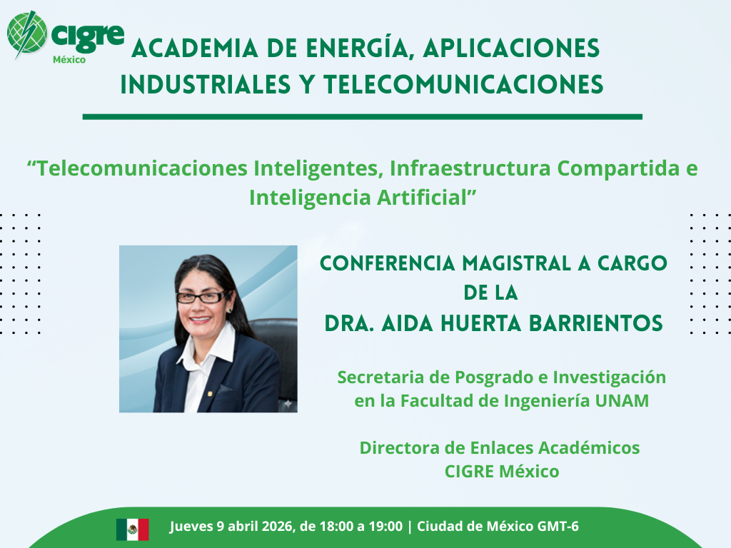 Estás invitado, CIGRE México | Academia de Energía, Aplicaciones Industriales y Telecomunicaciones, a la Conferencia “Telecomunicaciones Inteligentes, Infraestructura Compartida e Inteligencia Artificial” impartida magistralmente por la Dra. Aida Huerta Barrientos el jueves, 9 de abril de 2026 en un horario de 18:00 – 19:00 (GMT-6)